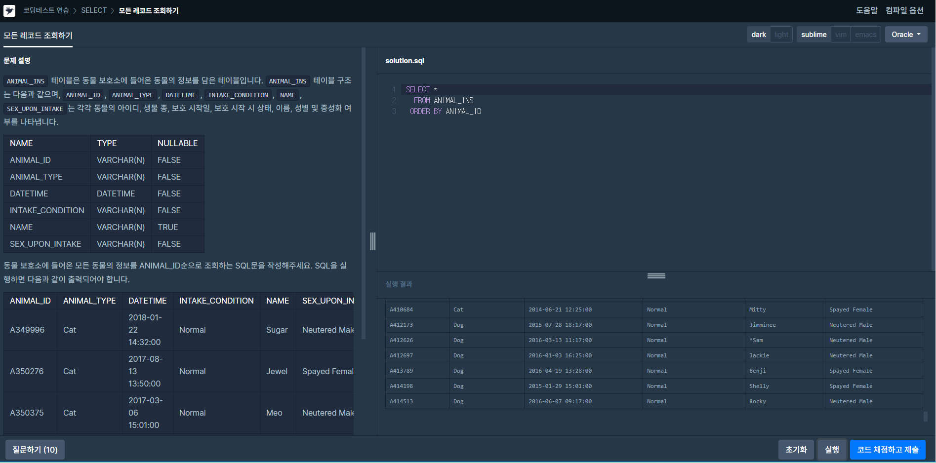 ANIMAL_INS 테이블은 동물 보호소에 들어온 동물의 정보를 담은 테이블입니다. ANIMAL_INS 테이블 구조는 다음과 같으며,